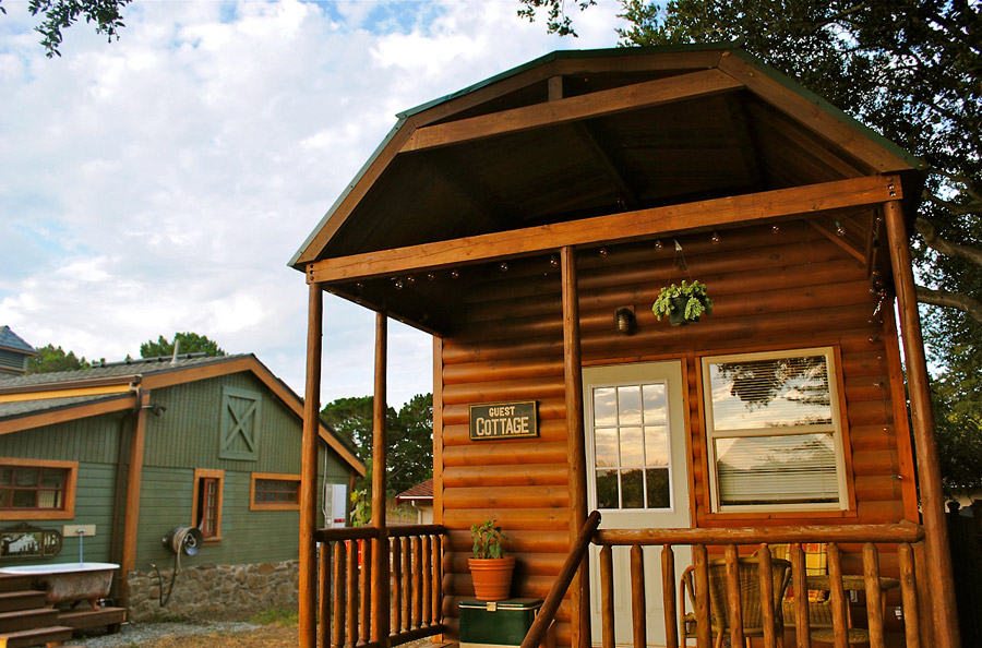 This neat little 12 x 24 mobile cabin sits in the Oakland CA hills and serves as guest quarters for interns who come to workshops held at our non-profit. Plunked right next to our dog shelter (‘the Rescue Barn’), the humans who stay here get plenty of four-legged visitors, including overnight guests. It has a full bath, galley kitchen, sleeps five comfortably and works out great for the on-site dogs who stop by for visits. The only complaint we get is when visitors’ canine guests snore too loud or hog the pillow at night. Discovered via Tiny House Listings in 2012, this was originally built by Adirondack Kabins in NY, and brought to CA to house park visitors.