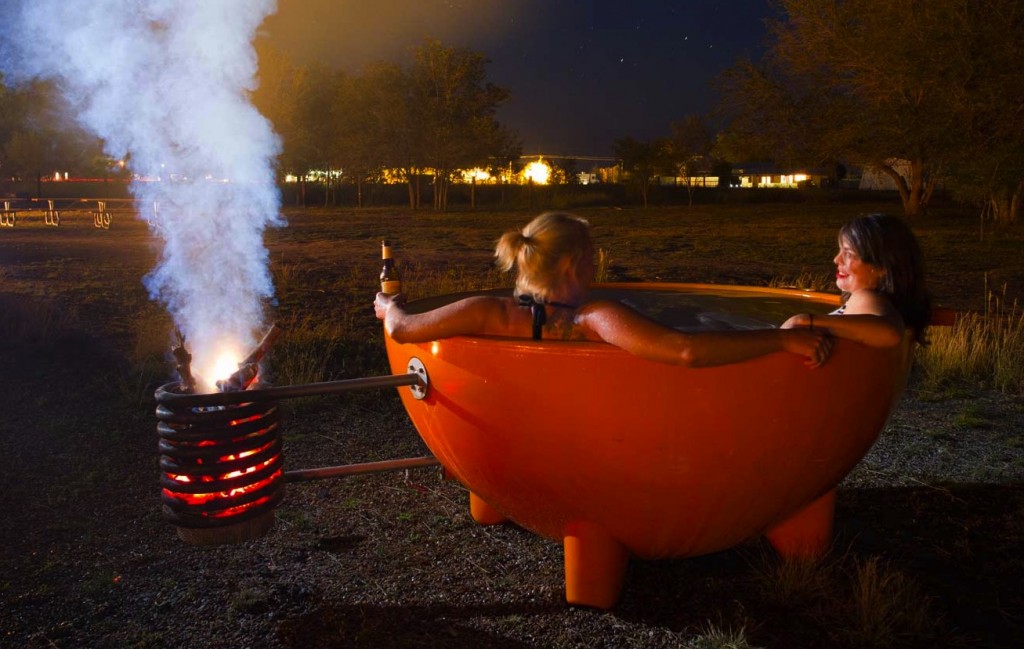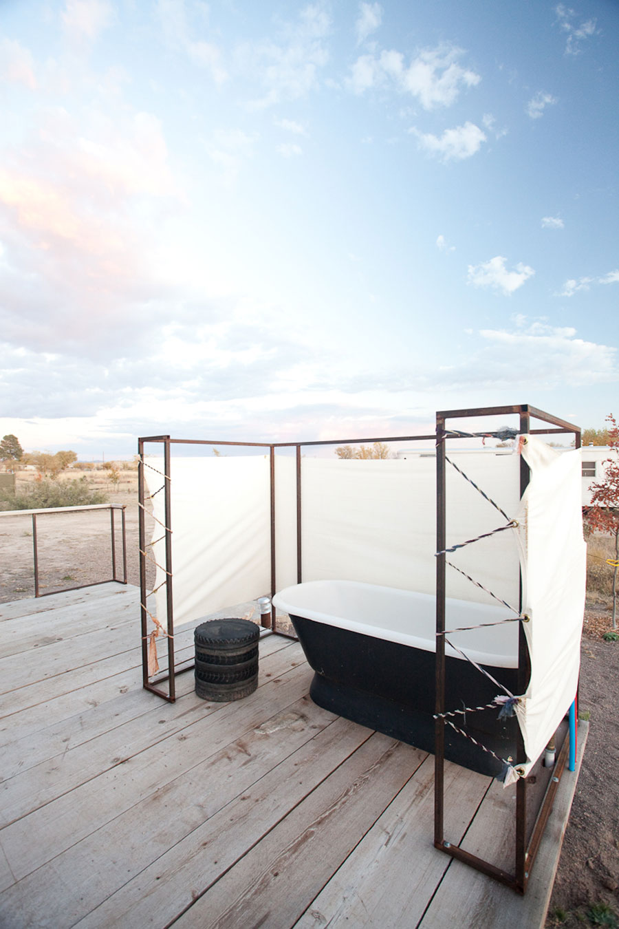 This trailer appears to be located at El Cosmico in Marfa, Texas. It’s an artistic motel. They have the same hot tubs and the trailers are rented out by the night like a hotel room – they also have yurts, teepees, and tent options if you want to get cheaper accomodations. 馃檪 Check them out at http://www.elcosmico.com