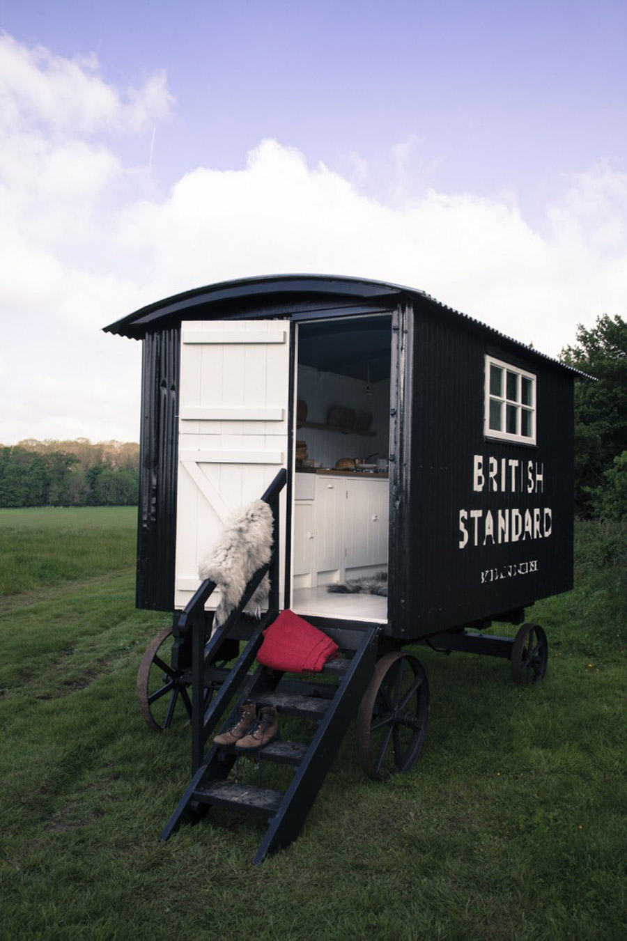 I’m surprised they didn’t put a bed in it at the end/back, like a Gypsy vardo. If someone were truly out there tending the sheep, would they really want to sleep on the floor? Speaking of floor, isn’t white a little impractical for a shepherd’s hut?