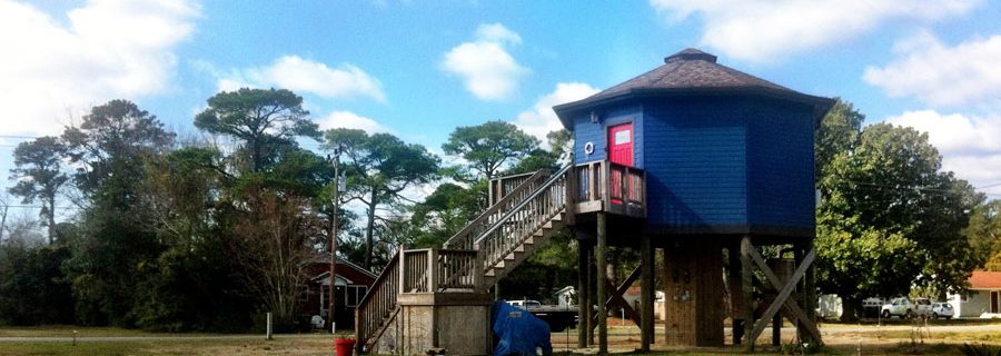 Tiny house sitting on stilts in a small North Carolina beach community.
