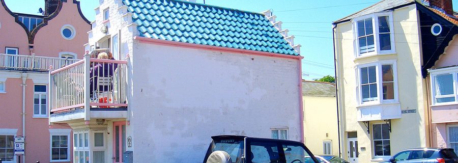 Tiny house with two stories and an upstairs balcony in Aldeburgh, Suffolk, England. Photo by Michael.