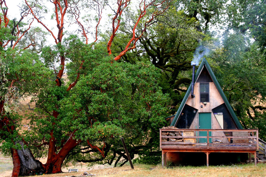 A 300 square feet off-grid a-frame cabin Mendocino County, California. More info. here.