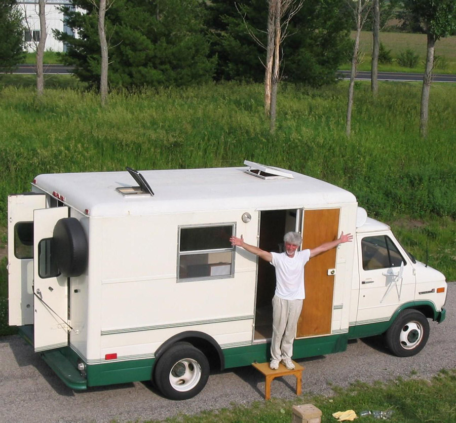 A 1986 GMC Vandura G-3500 cube van converted to a camper with a spacious feel. More info. here.