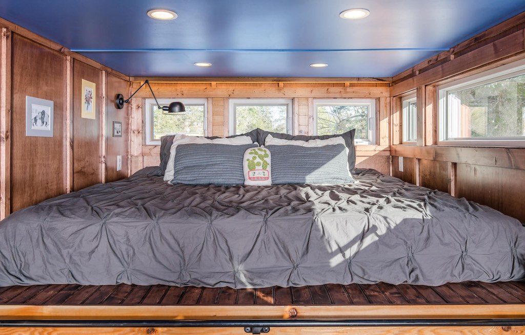 A guest tiny house that also serves as a writing studio for a popular author. Built by New Frontier Tiny Homes.