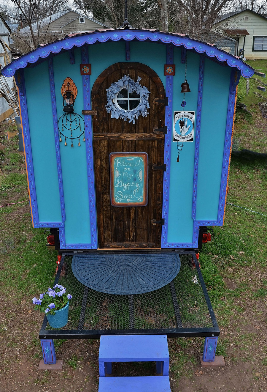 The Hobbit Hutch-a 56 sq ft vardo/caravan/gypsy wagon with a 20 sq ft porch. Has tiny appliance…faux wood stove…a/c…bed with pull out dining table…and soon the porch will have a propane outdoor shower and cassette toilet hidden away inside a plywood box seat…all surrounded by outdoor privacy curtains.
