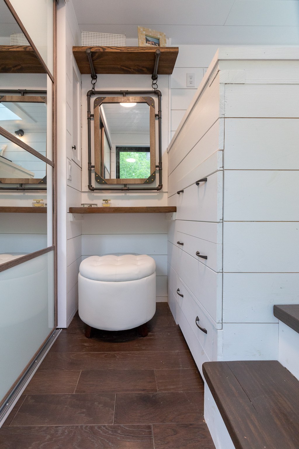 Erin-this is the best THOW that I’ve seen yet! I’ve been looking for over 3 years now for the perfect tiny design to fit my needs. Nothing comes close to matching what you designed here. You have truly created a home that is not only is functional, it embraces the tiny living movement without having to leave out some of the “wants” so there’s room for the “needs”. One of the “wants” I’m speaking of is the vanity you incorporated at the bottom of the master bedroom stairs. It was a phenomenal idea and a really cute touch that adds character to the space!