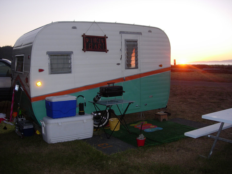 The two campsites are: Salt Creek on the Olympic Penninsula in Washington State (The sunset photo), and the little trailer in the big woods and kayak photos are from Muscle Beach in Uculet, B.C. Canada.