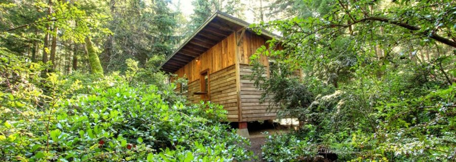 A metal roof, cedar-sided small cabin in the wilderness of Washington.