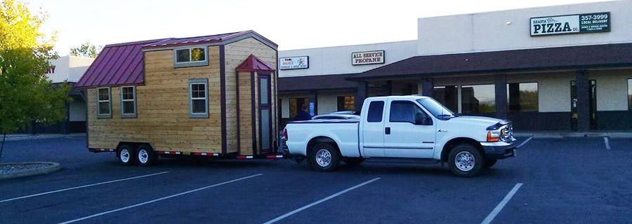 A tiny house parked in a yard in Seattle, Washington.