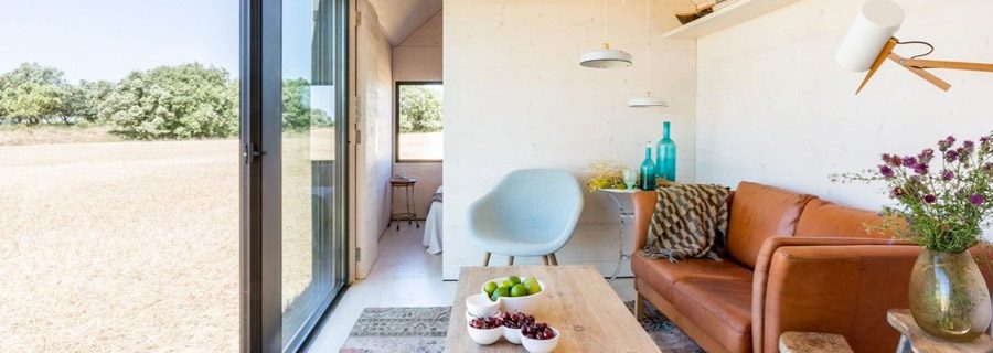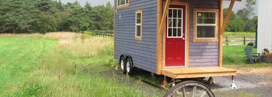 A tiny house on wheels with a removable front porch and nice-looking interior.