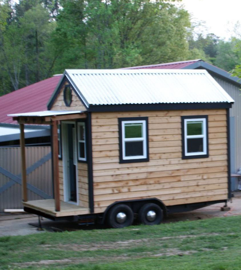 My tiny house is on a 8 ft x 16 ft heavy duty 10,000 lb tandem axle trailer. It was framed using only new premium lumber. It has cedar siding and industrial strength heavy gage aluminum on the roof. Everything was screwed and glued using 3″ screws. There is not a screw in this home that missed target. In a combined 50 years experience between my foreman and I, we have never seen a home built so right!!! I put a lot of love into this tiny little home!