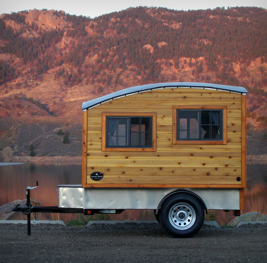 A small trailer-mounted wooden camper built by Casual Turtle Campers. More info. here.