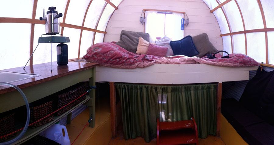 A tiny caravan built with a budget of $1,500. It has a solar panel mounted to frame above the canvas roof and a battery bank inside. Lightweight to be pulled by virtually any car. Learn more here.